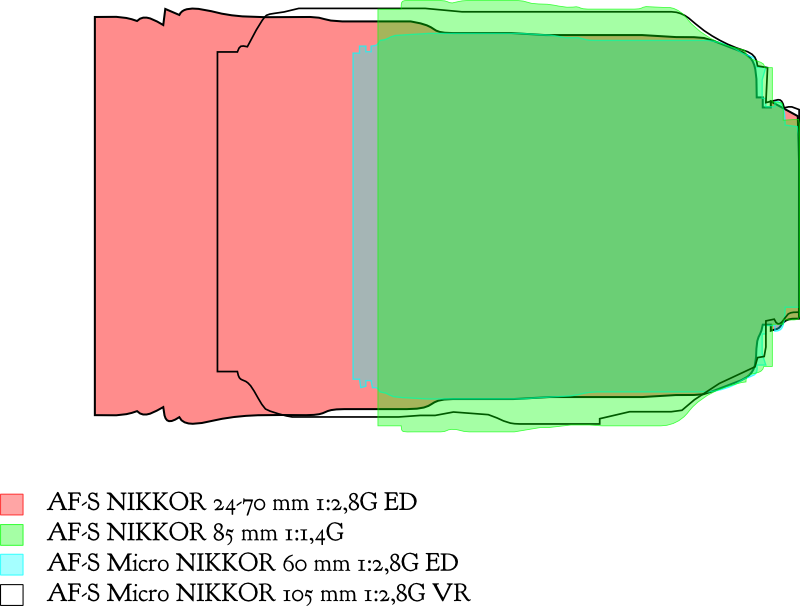 Die Linsen sind zahlreich und ebenso zahlreich sind die Unterschiede. Ein Wesentliches Merkmal sind für mich die Abmessungen. Es genügt nämlich nicht, eine Übertragungsfunktion und den Preis zu kennen. Wer ein Objektiv benutzen will, muss es in erster Linie auch tragen. Obwohl ich mehr als zwei Objektive besitze, ist eine meiner Beschränkungen auf Touren, nur zwei Linsen mitzunehmen. Da das auch alles noch in eine Tasche passen muss, die mit dem Rad portabel bleibt, ist eine Größenuntersuchung sehr hilfreich.