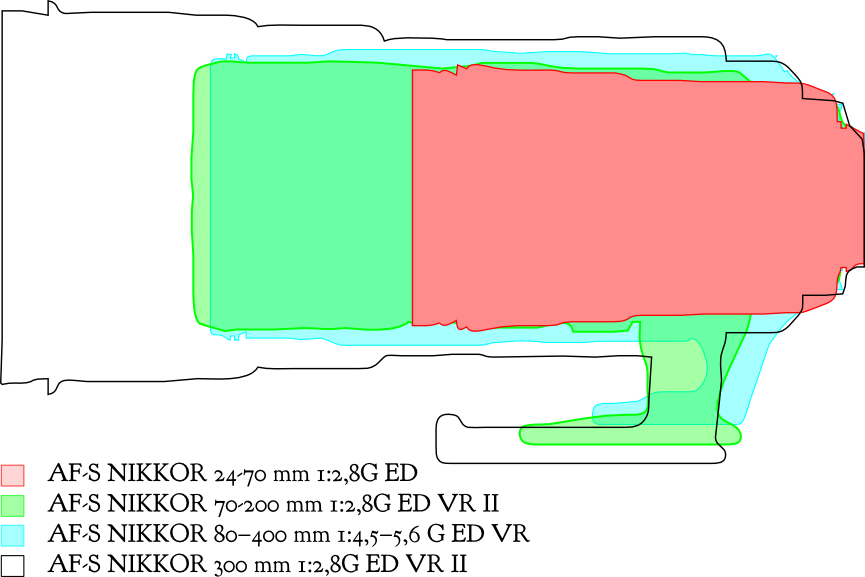Die obere Grafik dient nur dem relativen Vergleich der Portrait-tauglichen Brennweiten (50-85mm). Mit einem Klick auf die Legende lässt sich die jeweilige Linse aktivieren oder deaktivieren, um die Sichtbarkeit bzw. Vergleichbarkeit zu erhöhen. Die Grafik darunter zeigt ein paar Tele-Brennweiten im Relation zum recht häufigen 24-70er. Ich schwinge noch zwischen dem Erwerb des neuen 80-400ers und dem 300 f2.8 hin und her. Erstere Brennweite ersetzt das 70-200er und das 300er auf Reisen. Letztere ließe sich prima mit den vorhandenen Tele-Konvertern aufwerten – schwere Wahl.