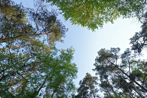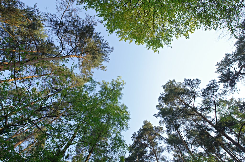 Der Wald ist dafür ideal. Also probierte ich verschiedene Perspektiven und Ausschnitte. Das erste Motiv fotografierte ich auf dem Rücken liegend mit senkrecht nach oben gerichtetem Blick. Bei der Höhe der Bäume kann man sehr schön erkennen, wie das Objektiv nicht nur an den Seiten verzerrt, sondern die Relation zwischen Hinter- und Vordergrund verschiebt. So scheint sich das Blätterdach über den Betrachter zu biegen.