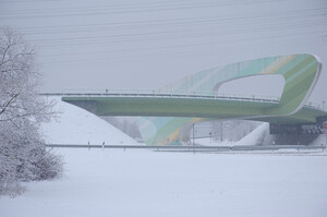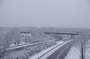 Kurzentschlossen nahm ich das geländegängige Veloziped und machte mich auf den Weg, die Verkehrswege zu erforschen. Der Wintereinbruch kam weniger überraschend als mehr heftig und so konnte ich an Schnellstraßen und Autobahnen die Fahrzeugkolonnen überholen oder musste lang warten, bis sich überhaupt einer auf den Weg traute. Der Main wahr ungehindert schiffbar. Die Stromleitungen – auch ein Verkehrsweg – zeigten sich am wenigsten beeindruckt. Sie sind es aber auch, die plötzlich den Durchgang abrupt und endgültig unmöglich machen, brechen sie unter der Last des Eises.