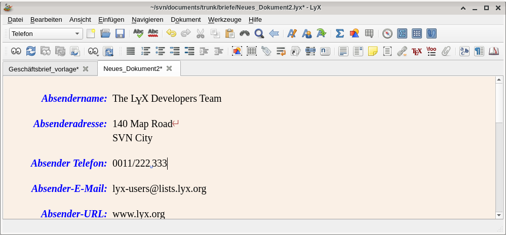Für die eigenen Geschäftsbriefe kann man die Datei nun anpassen und lokal speichern. Ich habe meist nur einen einzigen, mit meiner eigenen Anschrift. Für Geschäftsbriefe ist der DIN-Brief die richtige Vorlage. Der Koma-Brief lässt sich zwar ordentlich anpassen, Logos und Sachbearbeiter-Kennung bzw. Zeichen sind im DIN-Brief leichter einzusetzen.