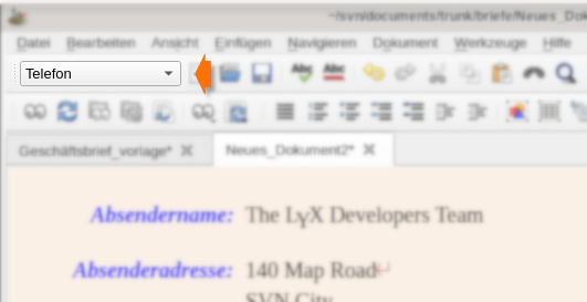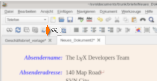 Wenn LyX geöffnet wurde bietet sich ein sehr einfacher Anblick. Die Menüleiste am oberen Rand erlaubt es, eine neue Datei anzulegen, natürlich von einer Vorlage. Es sollte u.a. Koma Letter V2/ kommaletterv2 oä. verfügbar sein. Diese auswählen und schon ist die Hauptansicht mit Text gefüllt. Am linken Rand werden Felder farblich hervorgehoben, bspw. Anrede, Betreff und Datum. Sollte das in der falschen Sprache sein: Menü - Dokument - Einstellungen - Sprache und die auf Deutsch setzen.